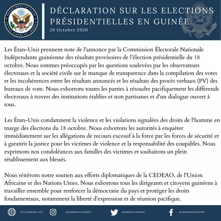 Dans une déclaration transmise aux médias, les États- Unis d’Amériques ont exprimé, ce mercredi 28 octobre 2020, leurs préoccupations sur le manque de transparence dans la compilation des votes et les incohérences entre les résultats annoncés et les résultats des procès-verbaux des bureaux de vote.