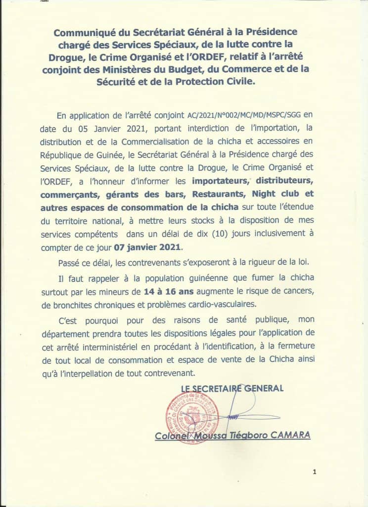 Dans un communiqué rendu public ce vendredi 8 janvier 2021, le directeur des services spéciaux et crimes organisés, Colonel Moussa Tiégboro Camara donne un délai de dix jours aux commerçants de la Chicha de se débarrasser de leurs marchandises. Arriver ces délais, la direction des services spéciaux et de la lutte contre la drogue et crimes organisés va user de toutes ses prérogatives pour appliquer la décision du gouvernement interdisant la commercialisation de la Chicha.
