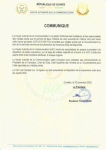 A travers un communiqué publié ce mardi, 22 novembre 2022, la Haute Autorité de la Communication (HAC) invite les associations de presse à procéder à la répartition de la subvention accordée aux médias qui est de Deux milliards-six cent-soixante dix millions-cinq cent-seize mille francs guinéens (2.670.516.000). Cette subvention constitue la 2ème tranche accordée à la presse pour l’année 2022 après la Loi Rectificative des Finances (LRF).