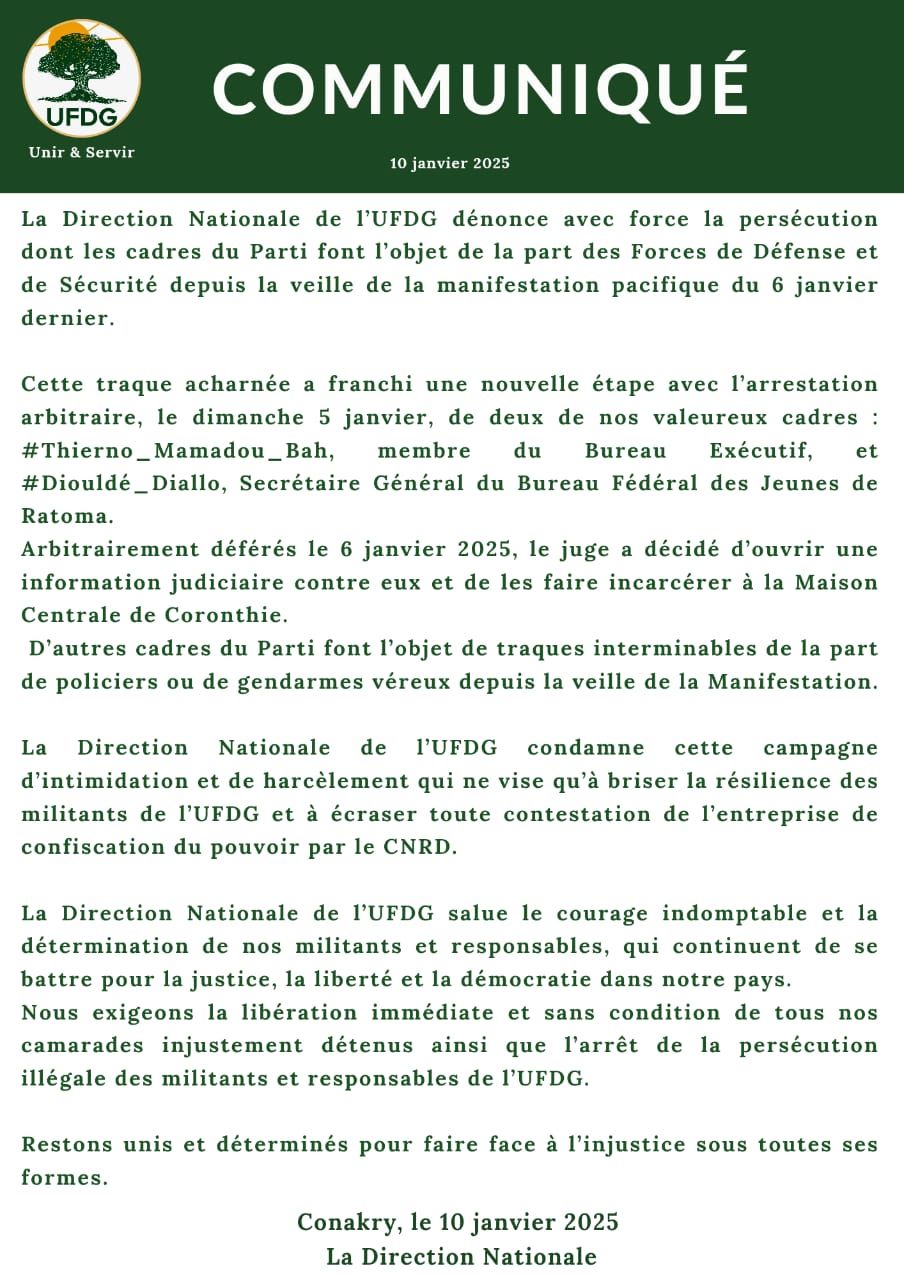 Tout en condamnant « cette campagne d’intimidation et de harcèlement », l’UFDG indique qu’elle vise à « briser la résilience » de ses « militants » pour « écraser toute contestation » contre « l’entreprise de confiscation du pouvoir par le CNRD. »