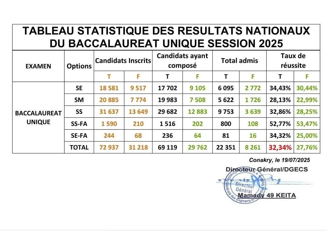 Ces chiffres ont été communiqués par le ministère de l’Enseignement pré-universitaire et de la Recherche scientifique. Selon les données officielles publiées par le Directeur général des examens et contrôles scolaires (DGECS), Mamady 49 Keita, 22 351 candidats ont été déclarés admis sur un total de 69 119 ayant composé, dont 8 261 filles.
