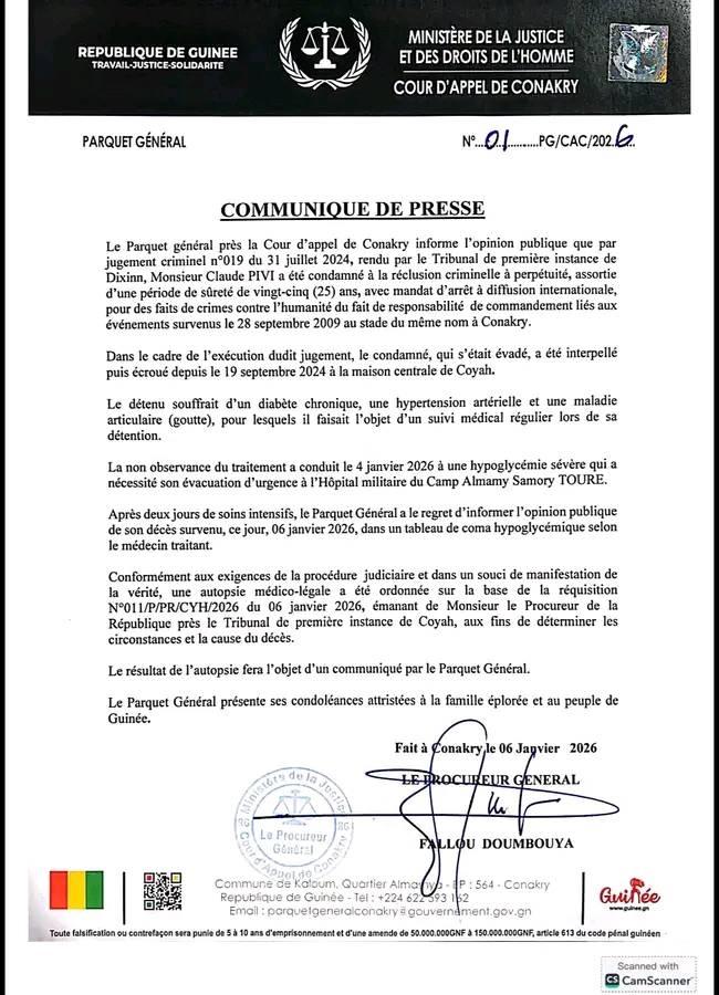 Selon un communiqué officiel du parquet général près la Cour d’appel de Conakry, le décès est survenu ce mardi 6 janvier 2026, des suites de maladie.