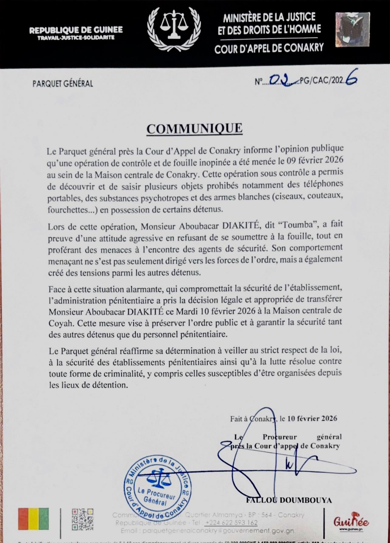 Dans un communiqué officiel, le parquet général est revenu sur les circonstances et les motifs de ce transfèrement, présenté comme une mesure visant à préserver l’ordre et la sécurité au sein de l’établissement pénitentiaire de Conakry. Selon la même source, les faits remontent à une « fouille inopinée » menée le lundi 9 février 2026 dans l’enceinte de la Maison centrale.